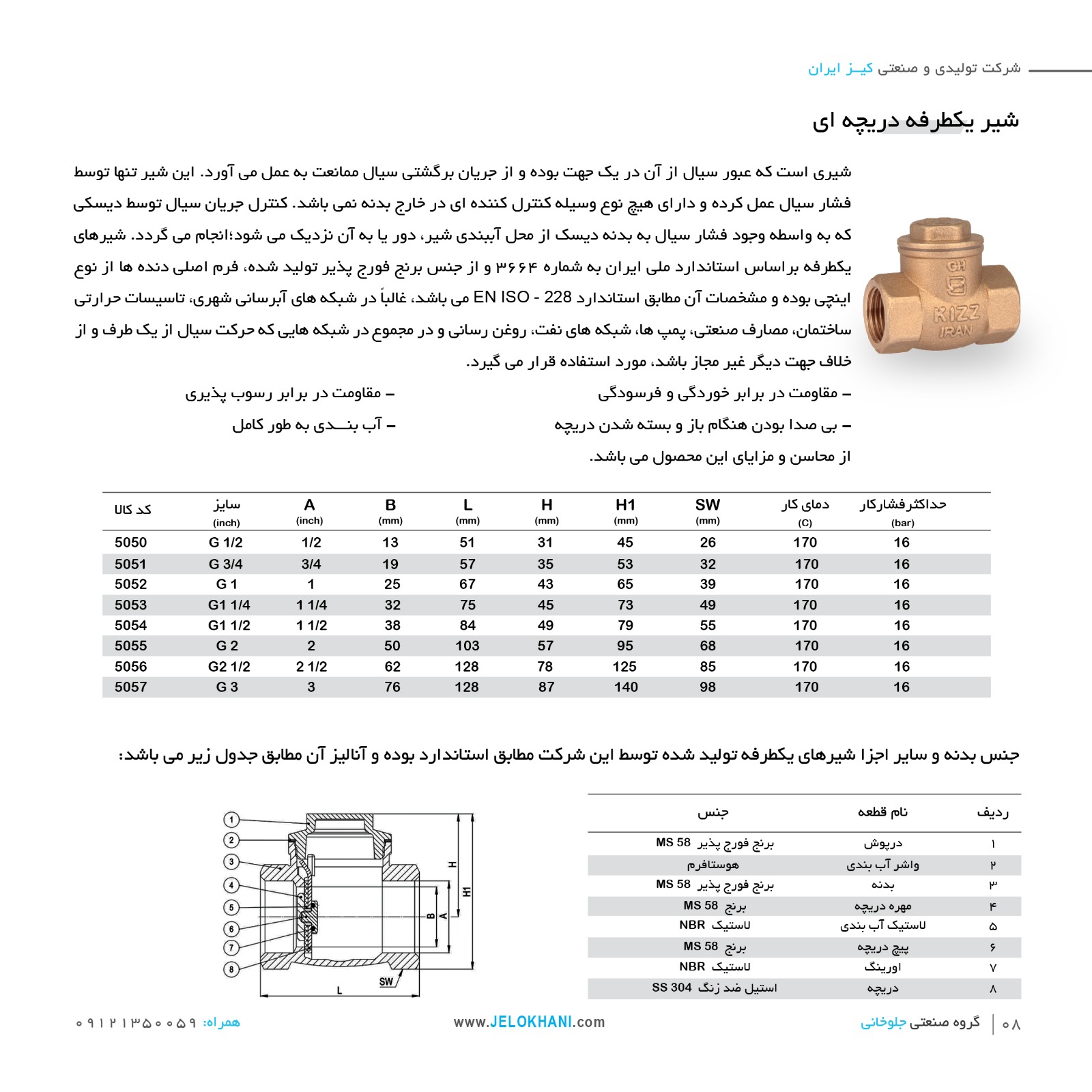 شیر یکطرفه فنری برنجی کیز ایران محصولی است که در آن جریان مایعات و سیالات تنها در یک جهت حرکت می کند و از برگشت جریان در عکس جهت ممانعت به عمل می آورد. کاربرد این شیر فقط به دلیل فشار زیاد سیال است و از هیچگونه عامل خارجی برای هدایت جریان استفاده نمی کند. نحوه کاربرد این شیر با دور یا نزدیک شدن دریچه از محل آب بندی شیر به واسطه فشار سیال می باشد.
